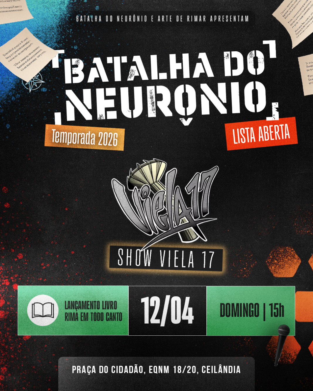 A Batalha do Neurônio promove, no próximo dia 12 de abril, o lançamento do livro “Rima em Todo Canto”, a partir das 15h, na Praça do Cidadão. A programação integra uma edição especial da batalha e promete reunir cultura, poesia e música em um dos principais pontos de encontro da periferia do Distrito Federal.