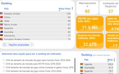 No setor de Games, os Estados Unidos aparecem como o mercado mais atrativo, seguidos por China, Índia, Reino Unido e Austrália, considerando a pontuação dos indicadores analisados. No setor de Softwares, a Índia lidera o ranking, com a maior pontuação geral.