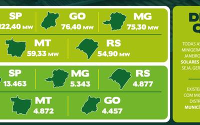 O estado de São Paulo se destacou em janeiro tanto em número de sistemas instalados quanto em potência. Foram 13.463 usinas que começaram a operar, um total de 122 MW. Já Goiás ficou em segundo lugar em expansão de potência da micro e da minigeração distribuída (MMGD) em janeiro, com 76 MW, seguido de Minas Gerais, com 75 MW.