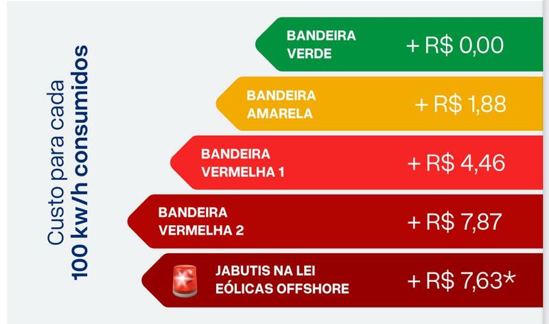 Segundo a FNCE, esse custo equivale a R$ 7,63 para cada 100kwh consumidos, praticamente o mesmo valor da tarifa estabelecida pela Agência Nacional de Energia Elétrica (Aneel) para a bandeira vermelha 2, que é R$ 7,87/100Kwh. Na bandeira vermelha 1 são cobrados R$ 4,46/10 kwh e na amarela R$ 1,88/10Kwh