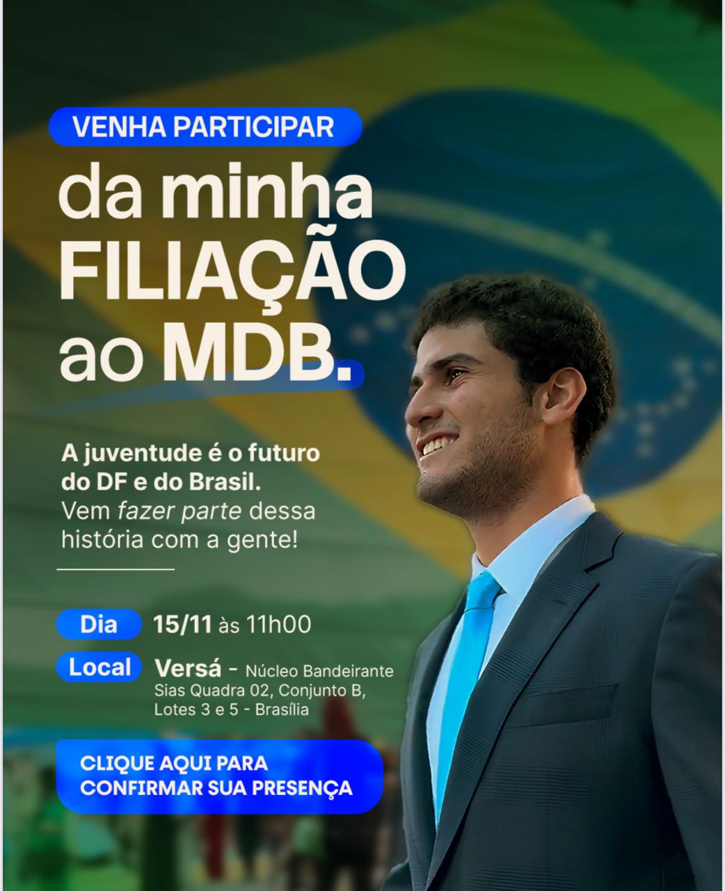 João Rocha, filho do governador do Distrito Federal, Ibaneis Rocha, vai oficializar sua filiação ao MDB no dia 15 de novembro. O anúncio foi feito por meio das redes sociais, onde o jovem destacou que o momento representa um passo importante para fortalecer a juventude e ampliar a participação de quem deseja transformar o DF.