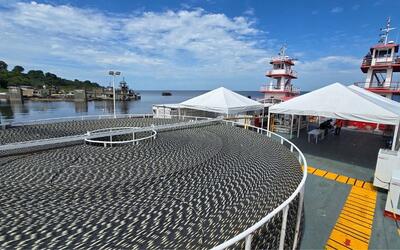 Uma plataforma acoplada a dois rebocadores está implantando os cabos sob as águas do rio Solimões, com quase uma centena de profissionais trabalhando. A embarcação sai de Tefé e vai até Benjamin Constant (AM), com previsão de chegada em 18 de fevereiro.