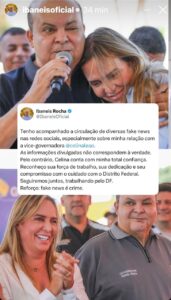 O governador do Distrito Federal, Ibaneis Rocha, usou as redes sociais nesta quinta-feira para rebater a circulação de notícias falsas envolvendo sua relação com a vice-governadora Celina Leão. Em publicação, Ibaneis classificou como “fake news” os conteúdos que vêm sendo compartilhados e reforçou que as informações “não correspondem à verdade”.