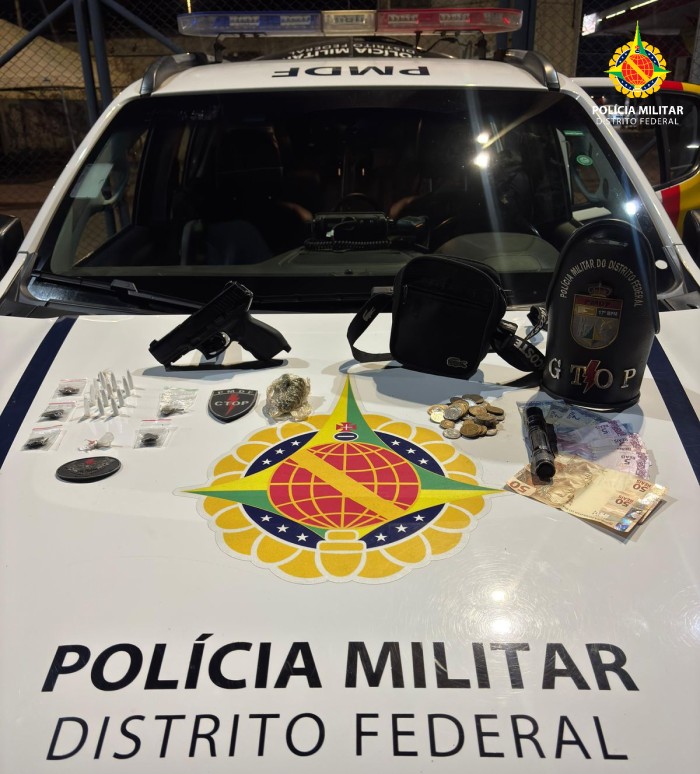 Diante da fundada suspeita, foi realizada a abordagem. Durante a verificação no local indicado, os policiais localizaram 13 pinos de substância análoga à cocaína, cinco papelotes de substância análoga à maconha e uma porção maior da mesma substância, pesando aproximadamente 50 gramas. Também foram apreendidos R$ 140 em espécie, R$ 12 em moedas e um simulacro de pistola com carregador.